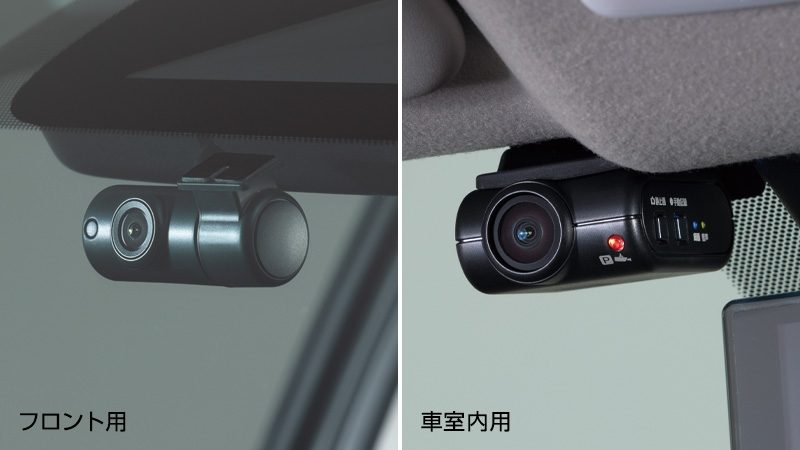 車室内カメラによる車内および車側面の撮影記録が駐車時の安心を高めるとともに、走行中の幅寄せ対策や後方撮影(リヤガラス越し)にも対応しています。車室内カメラのLED点灯と、セキュリティラベルは、駐車中のいたずらや盗難防止に役立ちます。